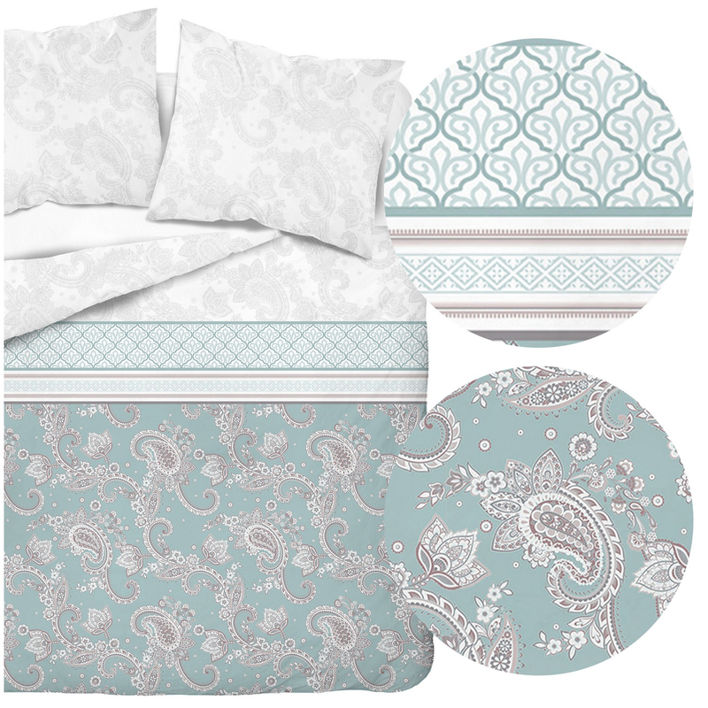 Pościel utrzymana jest w odcieniach bieli i niebieskiego. Znajdują się na niej duże wijące się rozety.
