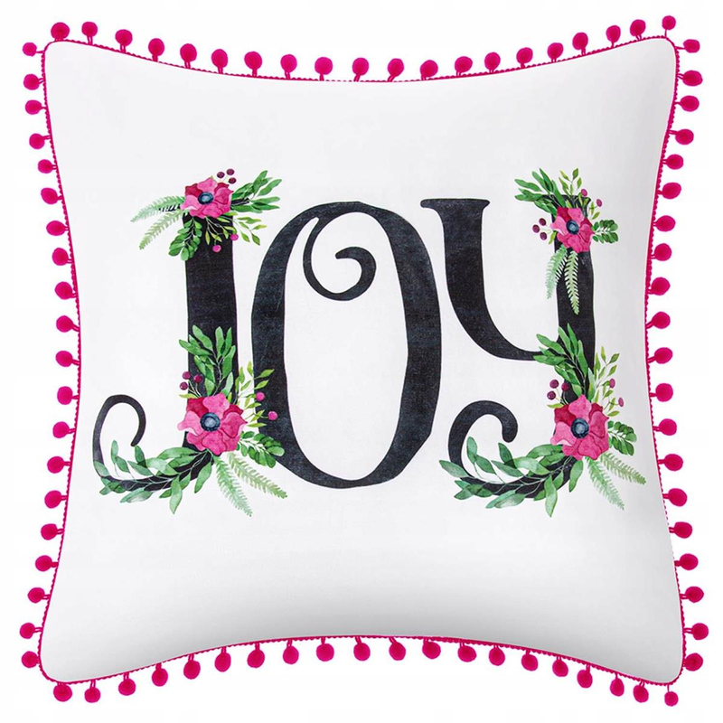 Poszewka Joy posiada standardowy wymiary 45x45 cm, dzięki czemu pasuje na poduszkę w dokładnie takim samym rozmiarze. Poszewka charakteryzuje się efektownym nadrukiem z przedniej strony, natomiast tył jest całkowicie gładki. Na obrzeżach została wykończona modnymi pomponami.