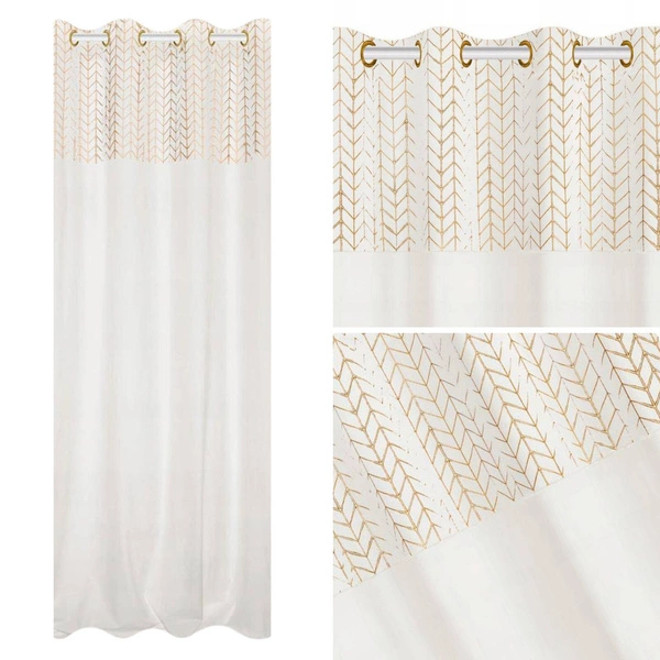 Posiada standardowy wymiary 140x250 cm oraz eleganckie mocowanie w postaci złotych kółek o średnicy 4 cm, które nie sprawiają problemów w założeniu na karniszy.