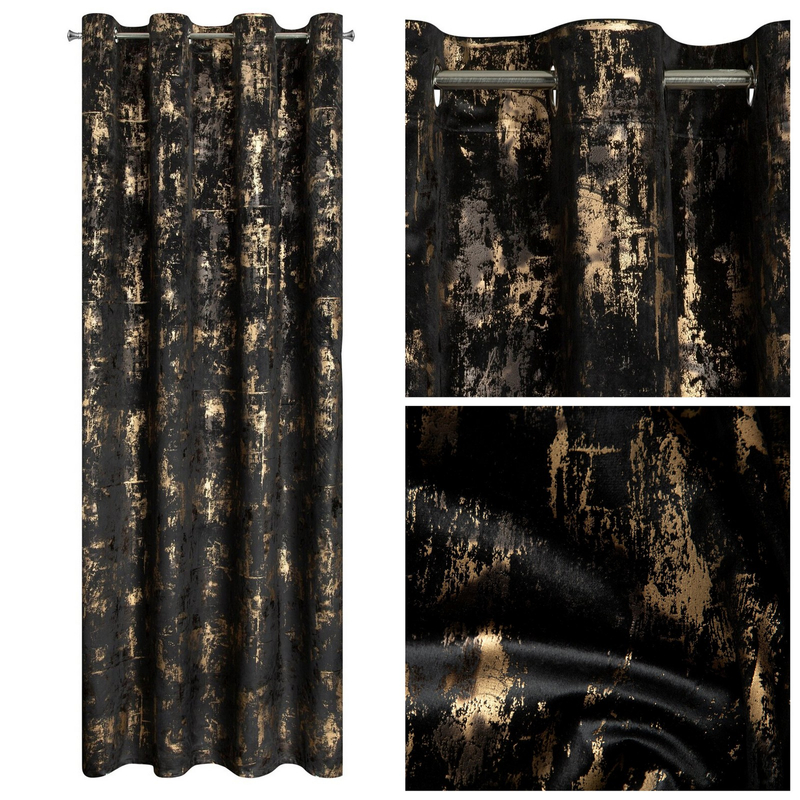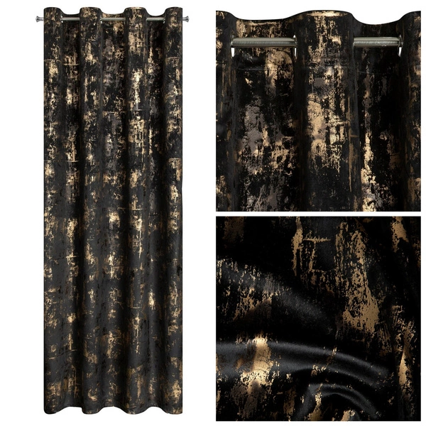 Zasłona zachwyca przecieranym złotym nadrukiem, który nadaje jej wyjątkowego blasku i elegancji. Subtelne wzory tworzą piękne akcenty na jedwabistym materiale, tworząc efektowny kontrast i dodając wnętrzu stylu glamour. Ta zasłona jest doskonałym wyborem dla tych, którzy pragną wprowadzić do swojego domu nieszablonowość wygląd.