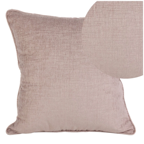Poszewka Avinion wykonana została z szenilowej tkaniny przetykanej srebrną nicią. Dodatkowo jej brzegi zdobi estetyczna wypustka. Produkt w odcieniu pudrowego różu doskonale sprawdzi się w nowoczesnych i modnych wnętrzach wprowadzając do nich powiew świeżości. Poszewkę wykorzystać można nie tylko w sypialni czy salonie, ale również na tarasie lub balkonie.