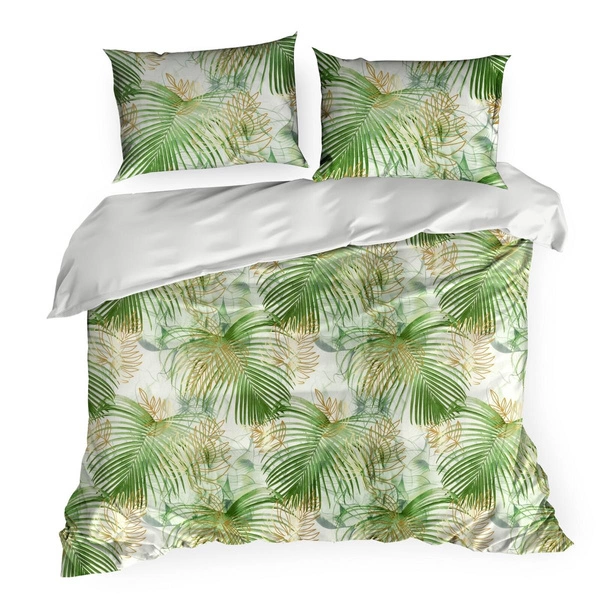 Komplet pościeli Nelly wykonany został z wysokiej jakości satyny bawełnianej. Tkanina charakteryzuje się gęstym satynowym splotem oraz połyskiem, dzięki czemu pościel jest przyjemna w dotyku, trwała i ciepła. Dodatkowo nie podrażnia skóry oraz nie wpływa na nadmierną potliwość ciała, co zapewnia komfortowy wypoczynek. Nowoczesna technika nadruku gwarantuje trwałość barw a wzór nie traci swojej intensywności nawet po wielu praniach. Na pościeli w biało-zielonym kolorze znajduje się nadruk przedstawiający liście palmy, zaś spodnia strona jest jednolita.