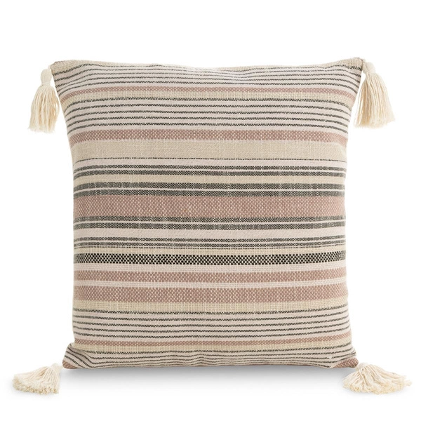 Jej brzegi zdobią modne frędzle, które dodają uroku i są niezwykle stylowe. Tkanina poszewki jest miękka i przyjazna w dotyku, dlatego dobrze będzie oprzeć się o nią i zrelaksować. Wielką zaletą jest dwustronność produktu - z jednej strony znajduje się wzór kolorowych pasów w stonowanych barwach, natomiast druga strona ma jednolity, pudrowy kolor. Dzięki temu możemy w łatwy sposób wprowadzić małą zmianę w wystroju jedynie przekręcając poduszkę.