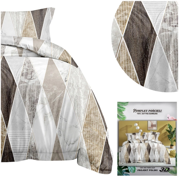 Pościel Maria została wykonana z satyny bawełnianej, dlatego jest przyjemna i miękka w dotyku. Jest bardzo wytrzymała, a także łatwa w pielęgnacji. Posiada właściwości higieniczne i utrzymuje ciepło. Zapinana jest na zamek błyskawiczny, dzięki czemu zmiana pościeli jest łatwa, szybka i sprawna. Nadruk jaki znajduje się na materiale naniesiony został technologią 3D. Doskonałe oddanie kolorów i nowoczesne wzory to cechy charakterystyczne tej kolekcji. Na komplecie znajduje się marmurkowy i geometryczny wzór w odcieniach kremu, szarości i brązu.
