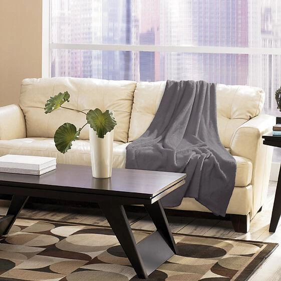 Nie posiada wzoru, a w połączeniu z jednolitym kolorem, bez problemu wpasuje się w każde wnętrze, subtelnie je uzupełniając. Znajdzie swoje zastosowanie zarówno jako dodatek do salonu, jak i dodatkowy kocyk w sypialni.