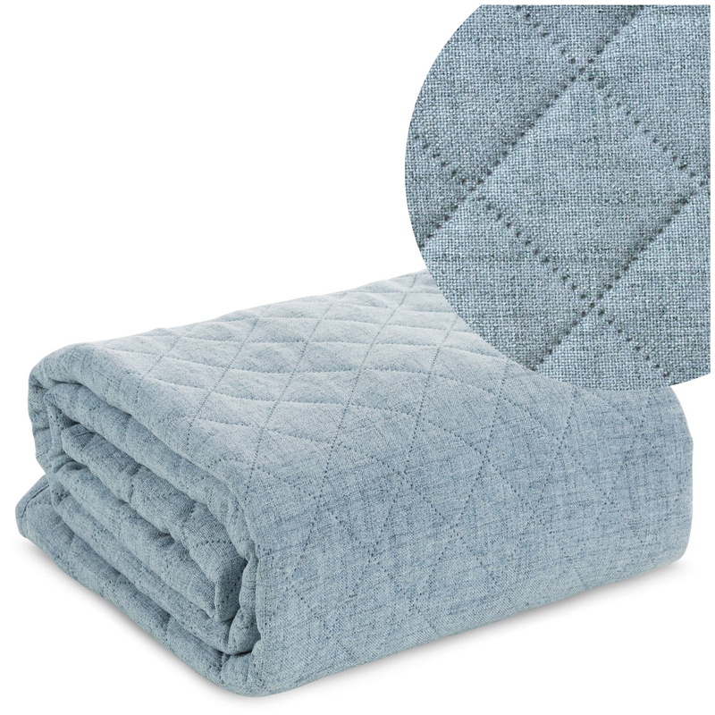 Narzuta Len wykonana została z materiału fakturą przypominającą strukturę lnu. Jednolity deseń w niebieskim kolorze zdobi pikowanie w geometryczny wzór.