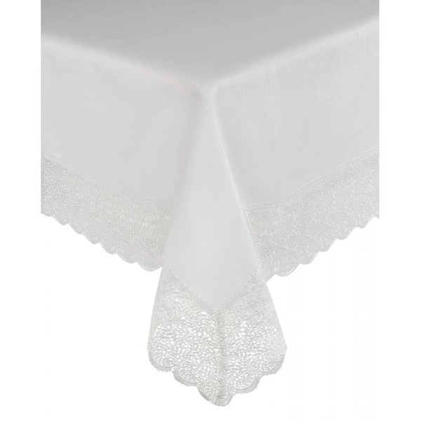 Wykonany z poliestrowej tkaniny, wykończonej bogato zdobioną koronką o szerokości 13 cm. Środek obrusu jest gładki, dzięki czemu ułatwia użytkowanie. Świetnie sprawdzi się zarówno na co dzień, jak i podczas wyjątkowych, rodzinnych chwil podczas świąt oraz uroczystości.