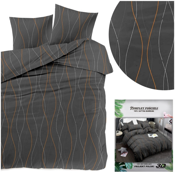 Nadruk jaki znajduje się na materiale naniesiony został technologią 3D. Doskonałe oddanie kolorów i nowoczesne wzory to cechy charakterystyczne tej kolekcji. Przedstawiony komplet w ciemnym odcieniu szarości przedstawia falujące kolorowe linie.