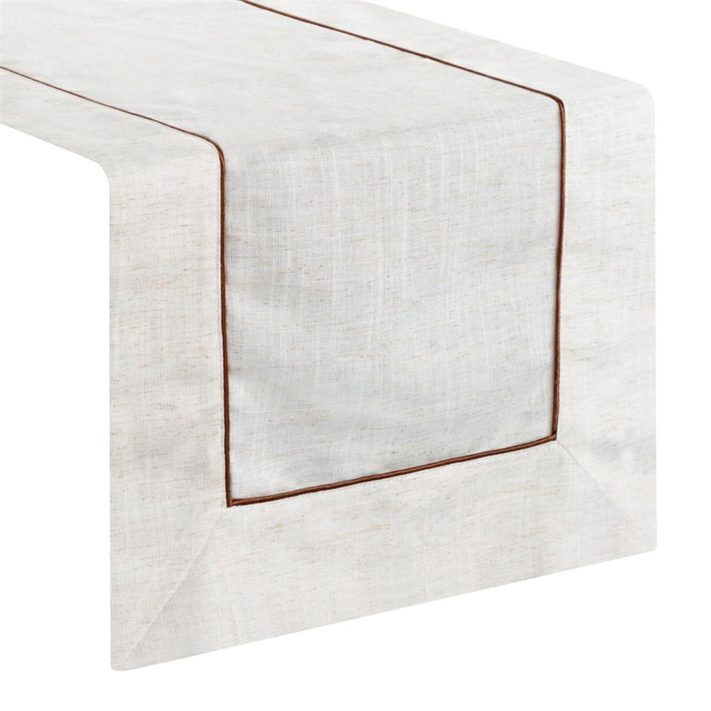 Eleganckie, klasyczne zdobienie złożone z podwójnej listwy oraz ciemniejszej, brązowej lamówki nada odświętnego charakteru. Bieżnik wykonano z tkaniny z dodatkiem lnu - ma naturalny wygląd, jest prosty w pielęgnacji, a dzięki odpowiedniej konserwacji będziesz cieszyć się nim przez długie lata w nienaruszonym stanie.