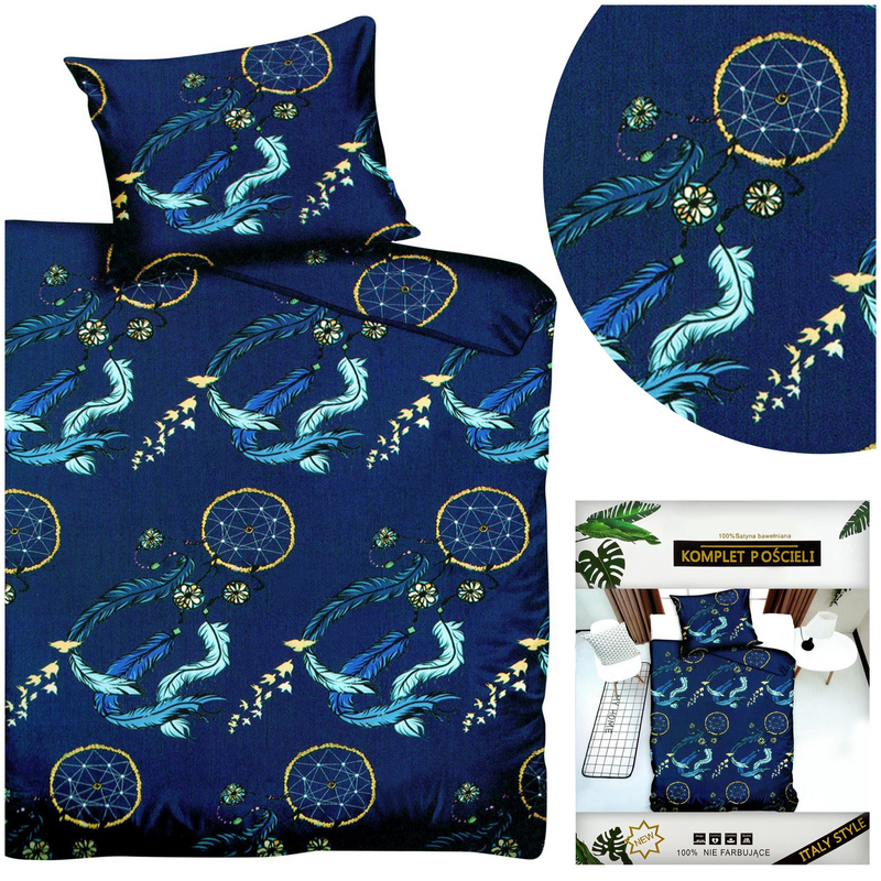 Doskonałe oddanie kolorów i nowoczesne wzory to charakterystyczne cechy pościeli Dalwin. Miłośnicy nietuzinkowych motywów docenią ich kreatywność, a fani stylowych barw będą wniebowzięci. Komplet dzięki swej prostocie i elegancji spełni oczekiwania każdego Klienta. Prezentowany model przedstawia łapacze snów na granatowym tle.