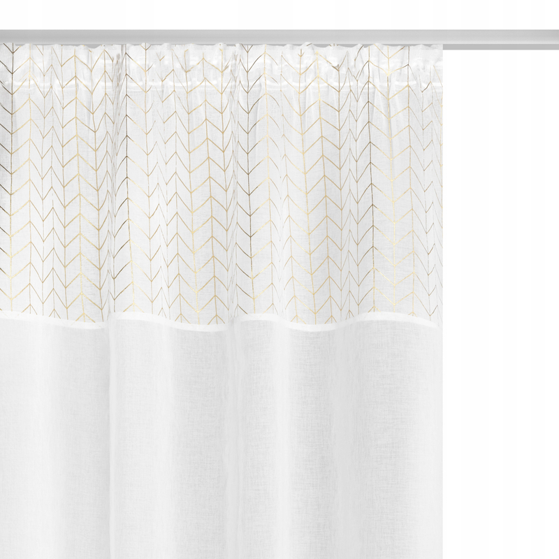 Firana NORD 140x270 charakteryzuje się gładkim, jednobarwnym deseniem, doskonale wpasuje się do wnętrz w stylu glamour. U góry posiada geometryczny złoty nadruk.