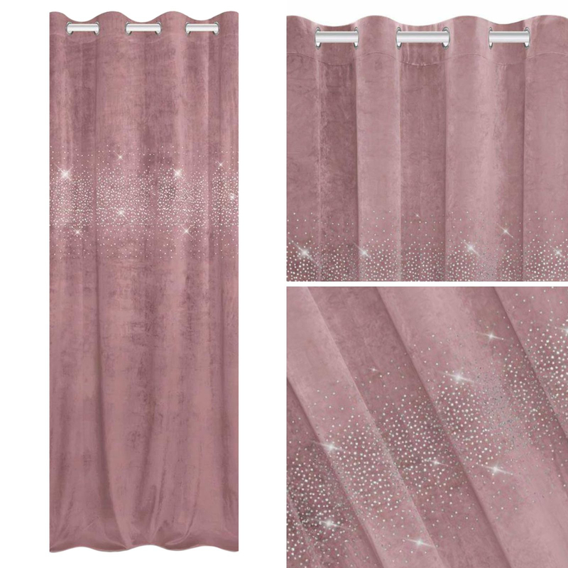 Welwetowa zasłona charakteryzuje się efektownymi kryształkami, które delikatnie odbijają światło dając efekt rozświetlenia wnętrza.