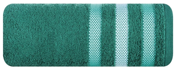 Bawełniany ręcznik to absolutny „must have” w każdej łazience. Materiał jest miękki i przyjemny w dotyku oraz łatwo i szybko chłonie wodę. Nie powoduje podrażnień, dlatego bez problemu może być używany zarówno przez dzieci, jak i dorosłych. Jednolity, zielony kolor ozdobiony bordiurą w pasy podkreśli styl łazienki oraz przepełni ją harmonią i elegancją. To również świetny i praktyczny pomysł na prezent.