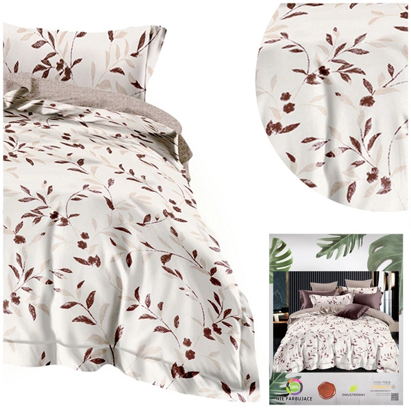 Komplet w odcieniach kremu oraz beżu przedstawia listki, natomiast spód nie posiada wzoru. Wybierz stronę, która najlepiej pasuje do Twojego nastroju i stylu sypialni!