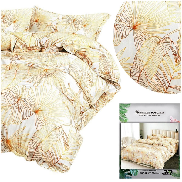 Nadruk jaki znajduje się na materiale naniesiony został technologią 3D. Doskonałe oddanie kolorów i nowoczesne wzory to cechy charakterystyczne tej kolekcji. Na komplecie znajduje się nadruk przedstawiający złote liście.