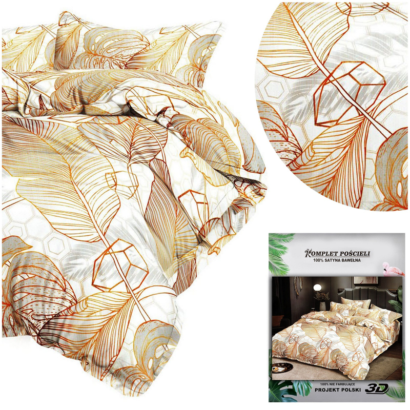 Nadruk jaki znajduje się na materiale naniesiony został technologią 3D. Doskonałe oddanie kolorów i nowoczesne wzory to cechy charakterystyczne tej kolekcji. Na komplecie znajduje się nadruk przedstawiający złote liście.