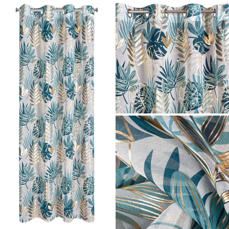 Wykonana z trwałego poliestru, zasłona jest półprzezroczysta, co umożliwia delikatne przenikanie światła, jednocześnie zapewniając odpowiednią prywatność. Delikatna biel harmonijnie kontrastuje z akcentami w ożywczym turkusie, dodając wnętrzu świeżości i energii.
