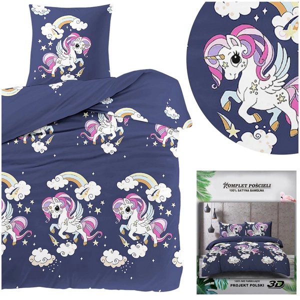 Nadruk jaki znajduje się na materiale naniesiony został technologią 3D. Doskonałe oddanie kolorów i nowoczesne wzory to cechy charakterystyczne tej kolekcji. Na komplecie znajduje się nadruk przedstawiający jednorożce na niebielskim tle.
