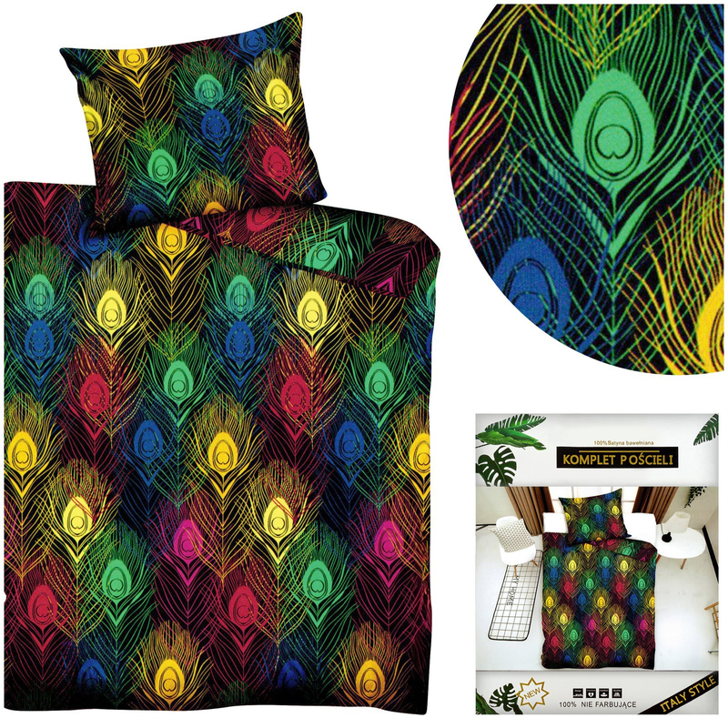 Doskonałe oddanie kolorów i nowoczesne wzory to charakterystyczne cechy pościeli Dalwin. Miłośnicy nietuzinkowych motywów docenią ich kreatywność, a fani stylowych barw będą wniebowzięci. Komplet dzięki swej prostocie i elegancji spełni oczekiwania każdego Klienta. Prezentowany model przedstawia kolorowe pawie pióra na czarnym tle.