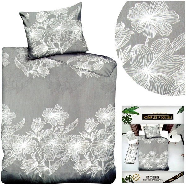 Doskonałe oddanie kolorów i nowoczesne wzory to charakterystyczne cechy pościeli Dalwin. Miłośnicy nietuzinkowych motywów docenią ich kreatywność, a fani stylowych barw będą wniebowzięci. Komplet dzięki swej prostocie i elegancji spełni oczekiwania każdego Klienta. Prezentowany model przedstawia kwiaty na szarym tle.