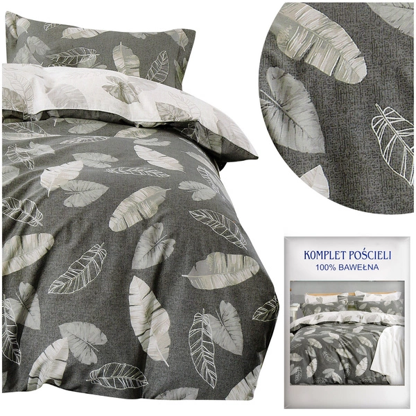 Pościel z satyny bawełnianej to wysokiej jakości materiał o splocie satynowym z włókien bawełnianych, zapewniający wyjątkową miękkość. Ten rodzaj tkaniny wyróżnia się delikatnym połyskiem i jest aksamitny w dotyku. Wysoka struktura włókien pozwala na swobodną cyrkulację powietrza, dzięki czemu, zimą daje nam ciepło a latem chłodzi. Naturalny skład zapewnia, że nasza skóra będzie mogła pod nią swobodnie oddychać. Dodatkowym atutem pościeli jest jej łatwość użytkowania gdyż nie jest śliska, bardzo dobrze przylega do kołdry. Komplet przedstawia liście na szarym tle.