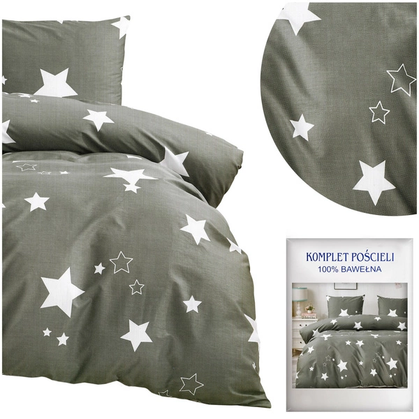 Pościel z satyny bawełnianej to wysokiej jakości materiał o splocie satynowym z włókien bawełnianych, zapewniający wyjątkową miękkość. Ten rodzaj tkaniny wyróżnia się delikatnym połyskiem i jest aksamitny w dotyku. Wysoka struktura włókien pozwala na swobodną cyrkulację powietrza, dzięki czemu, zimą daje nam ciepło a latem chłodzi. Naturalny skład zapewnia, że nasza skóra będzie mogła pod nią swobodnie oddychać. Dodatkowym atutem pościeli jest jej łatwość użytkowania gdyż nie jest śliska, bardzo dobrze przylega do kołdry. Komplet przedstawia białe gwiazdki na szarym tle.