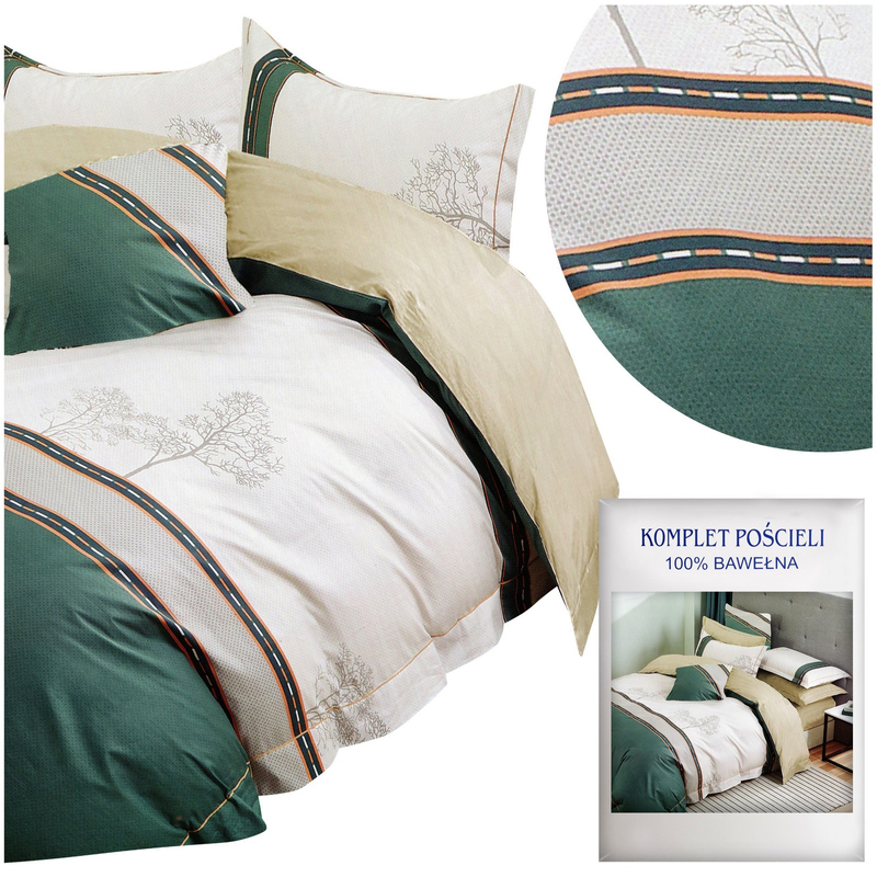 Pościel z satyny bawełnianej to wysokiej jakości materiał o splocie satynowym z włókien bawełnianych, zapewniający wyjątkową miękkość. Ten rodzaj tkaniny wyróżnia się delikatnym połyskiem i jest aksamitny w dotyku. Wysoka struktura włókien pozwala na swobodną cyrkulację powietrza, dzięki czemu, zimą daje nam ciepło a latem chłodzi. Naturalny skład zapewnia, że nasza skóra będzie mogła pod nią swobodnie oddychać. Dodatkowym atutem pościeli jest jej łatwość użytkowania gdyż nie jest śliska, bardzo dobrze przylega do kołdry. Komplet przedstawia drzewa oraz motyw geometryczny na tle w kolorze bieli oraz zielni.