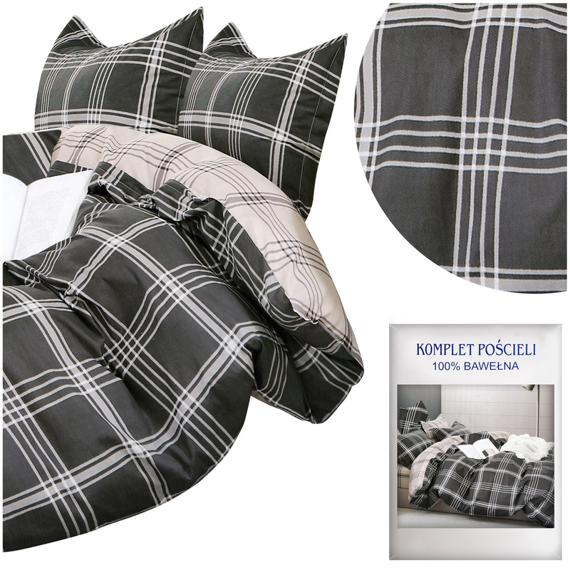Pościel z satyny bawełnianej to wysokiej jakości materiał o splocie satynowym z włókien bawełnianych, zapewniający wyjątkową miękkość. Ten rodzaj tkaniny wyróżnia się delikatnym połyskiem i jest aksamitny w dotyku. Wysoka struktura włókien pozwala na swobodną cyrkulację powietrza, dzięki czemu, zimą daje nam ciepło a latem chłodzi. Naturalny skład zapewnia, że nasza skóra będzie mogła pod nią swobodnie oddychać. Dodatkowym atutem pościeli jest jej łatwość użytkowania gdyż nie jest śliska, bardzo dobrze przylega do kołdry. Komplet przedstawia dużą kratę na ciemnoszarym tle.