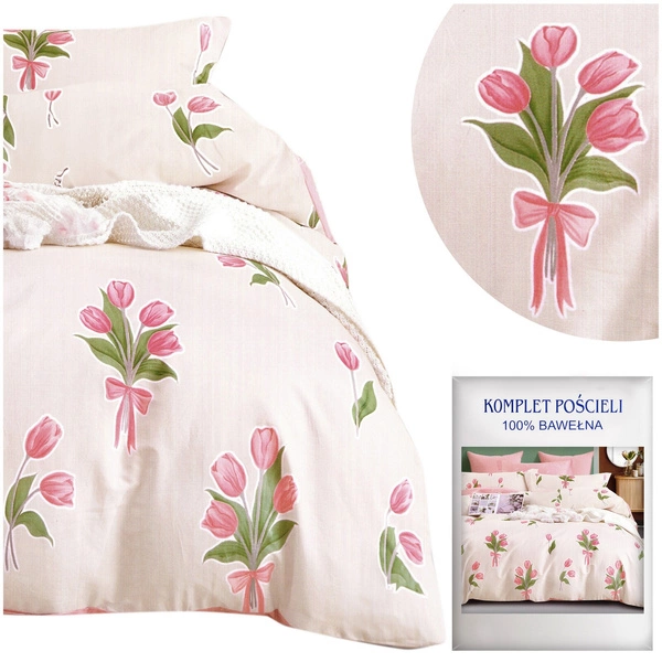 Pościel z satyny bawełnianej to wysokiej jakości materiał o splocie satynowym z włókien bawełnianych, zapewniający wyjątkową miękkość. Ten rodzaj tkaniny wyróżnia się delikatnym połyskiem i jest aksamitny w dotyku. Wysoka struktura włókien pozwala na swobodną cyrkulację powietrza, dzięki czemu, zimą daje nam ciepło a latem chłodzi. Naturalny skład zapewnia, że nasza skóra będzie mogła pod nią swobodnie oddychać. Dodatkowym atutem pościeli jest jej łatwość użytkowania gdyż nie jest śliska, bardzo dobrze przylega do kołdry. Komplet przedstawia różowe tulipany na kremowym tle.