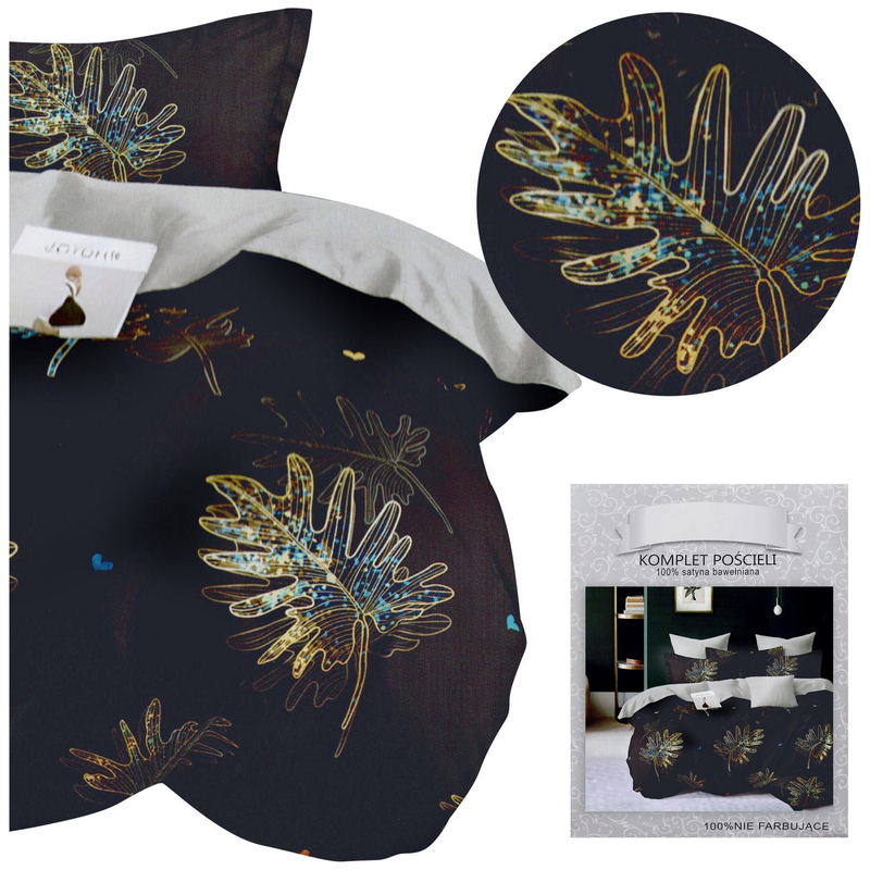 Pościel Melita wykonana jest z satyny bawełnianej, a dzięki specjalnemu splotowi ma lekki połysk. Jest miękka i miła w dotyku oraz posiada wyjątkowo żywe i nasycone kolory, które zachwycą najbardziej wymagającego klienta. Pościel wyróżnia się modnym i eleganckim wzornictwem, dzięki czemu z pewnością dopasuje się do każdego wnętrza. Komplet przedstawia złote liście na czarnym tle.