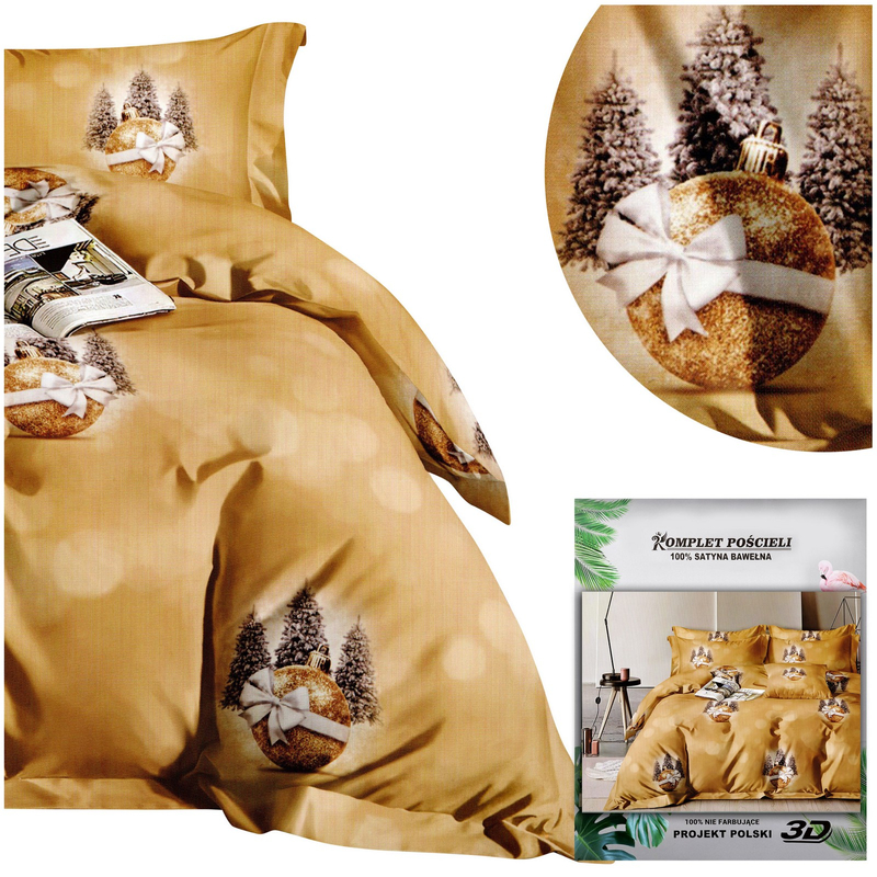 Nadruk jaki znajduje się na materiale naniesiony został technologią 3D. Doskonałe oddanie kolorów i nowoczesne wzory to cechy charakterystyczne tej kolekcji. Na komplecie znajduje się świąteczny nadruk przedstawiający pombki i choinki na złotym tle.