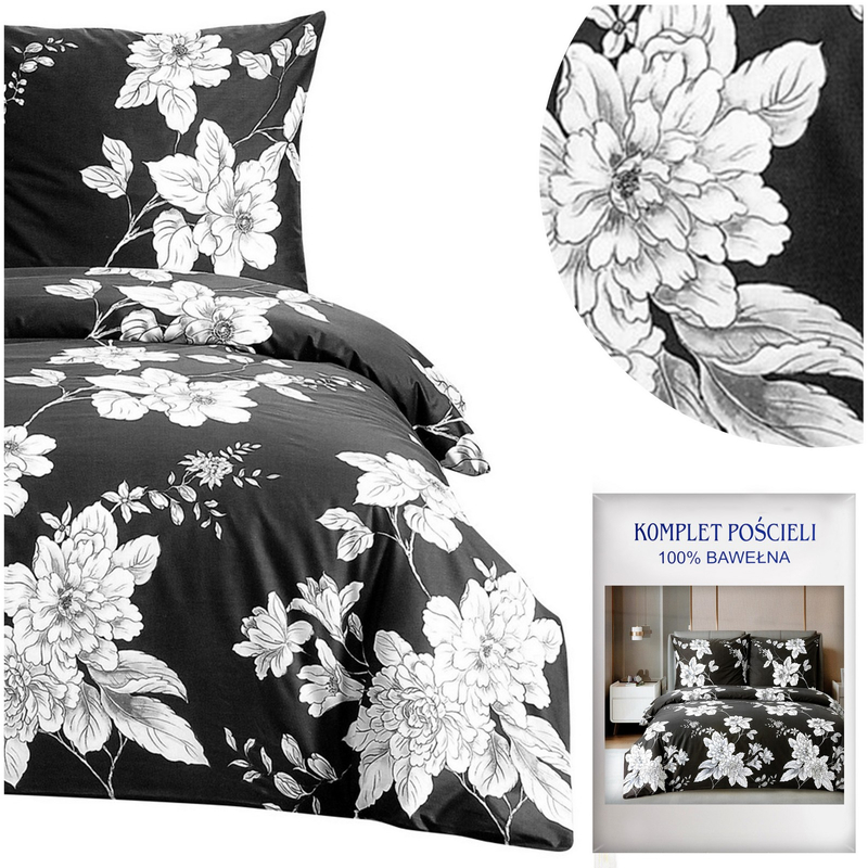 Pościel z satyny bawełnianej to wysokiej jakości materiał o splocie satynowym z włókien bawełnianych, zapewniający wyjątkową miękkość. Ten rodzaj tkaniny wyróżnia się delikatnym połyskiem i jest aksamitny w dotyku. Wysoka struktura włókien pozwala na swobodną cyrkulację powietrza, dzięki czemu, zimą daje nam ciepło a latem chłodzi. Naturalny skład zapewnia, że nasza skóra będzie mogła pod nią swobodnie oddychać. Dodatkowym atutem pościeli jest jej łatwość użytkowania gdyż nie jest śliska, bardzo dobrze przylega do kołdry. Komplet w odcieniu czarnego przedstawia kwiaty.