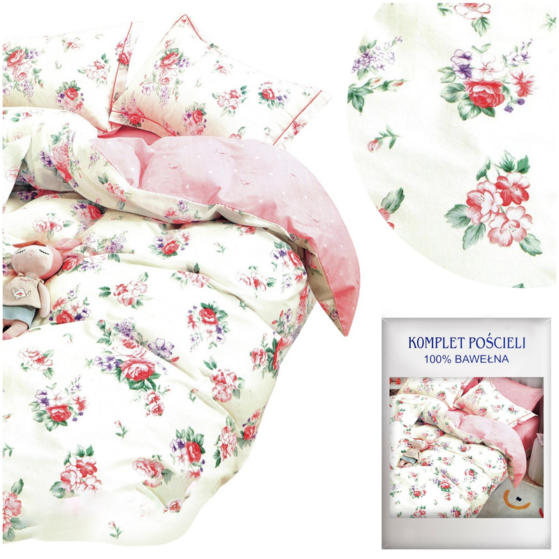 Pościel z satyny bawełnianej to wysokiej jakości materiał o splocie satynowym z włókien bawełnianych, zapewniający wyjątkową miękkość. Ten rodzaj tkaniny wyróżnia się delikatnym połyskiem i jest aksamitny w dotyku. Wysoka struktura włókien pozwala na swobodną cyrkulację powietrza, dzięki czemu, zimą daje nam ciepło a latem chłodzi. Naturalny skład zapewnia, że nasza skóra będzie mogła pod nią swobodnie oddychać. Dodatkowym atutem pościeli jest jej łatwość użytkowania gdyż nie jest śliska, bardzo dobrze przylega do kołdry. Komplet przedstawia kolorowe kwiaty na kremowym tle. Druga strona jest różowa.