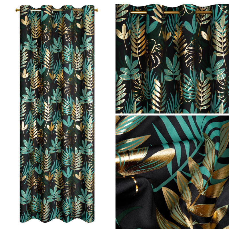 Motyw liści, wyraźnie zarysowany na czarnym tle, wprowadza do wnętrza odrobinę natury, tworząc relaksującą i spokojną atmosferę. Wzór liści jest w odcieniach zieleni, co dodaje zasłonie wyrafinowanego charakteru.