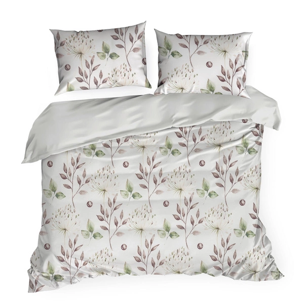 Komplet pościeli Sonia wykonany jest w wysokogatunkowej tkaniny bawełnianej, dzięki czemu jest przyjemny w dotyku, a także przewiewny. Zaletą pościeli jest jej trwałość oraz lekkość, a także duży komfort cieplny. Materiał przyjemnie otula ciało zapewniając całonocny wypoczynek. Nowoczesna technika barwienia i nadruku pozwala na długo zachować kolorystykę i nasycenie barw mimo wielokrotnego prania. Dwustronny komplet wyróżnia piękny nadruk przedstawiający roślinny motyw, natomiast spód pościeli jest jednolity.