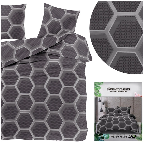 Nadruk jaki znajduje się na materiale naniesiony został technologią 3D. Doskonałe oddanie kolorów i nowoczesne wzory to cechy charakterystyczne tej kolekcji. Na komplecie znajduje się nadruk przedstawiający geometryczne wzory na szarym tle.