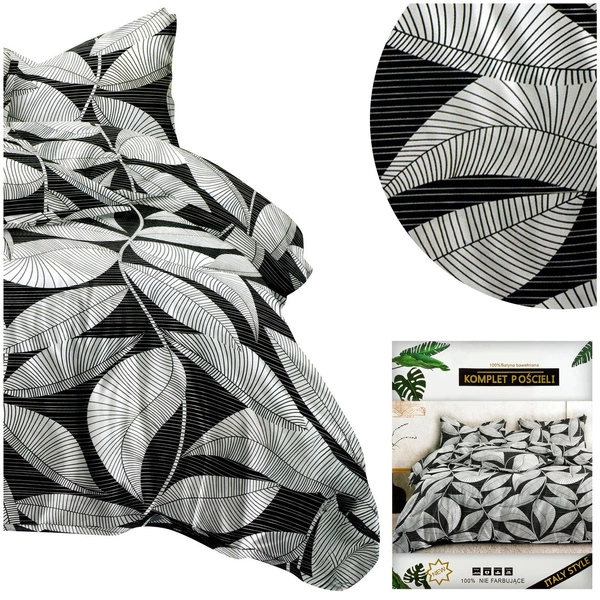 Doskonałe oddanie kolorów i nowoczesne wzory to charakterystyczne cechy pościeli Dalwin. Miłośnicy nietuzinkowych motywów docenią ich kreatywność, a fani stylowych barw będą wniebowzięci. Komplet dzięki swej prostocie i elegancji spełni oczekiwania każdego Klienta. Prezentowany model przedstawia liście na czarnym tle.