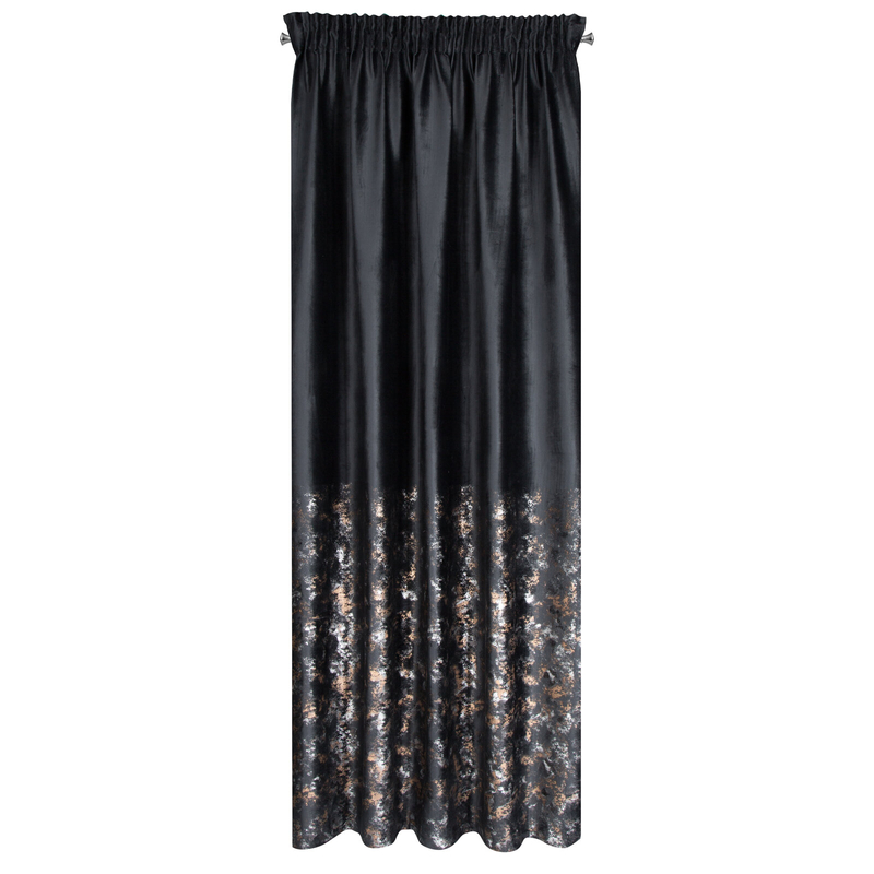 U dołu zasłony zastosowano subtelny, metaliczny nadruk, który pięknie odbija światło i nadaje zasłonie unikalnego charakteru. To ozdobny akcent, który przyciąga spojrzenia, nie dominując przy tym reszty wystroju. Idealna równowaga między klasyką a nowoczesnością.