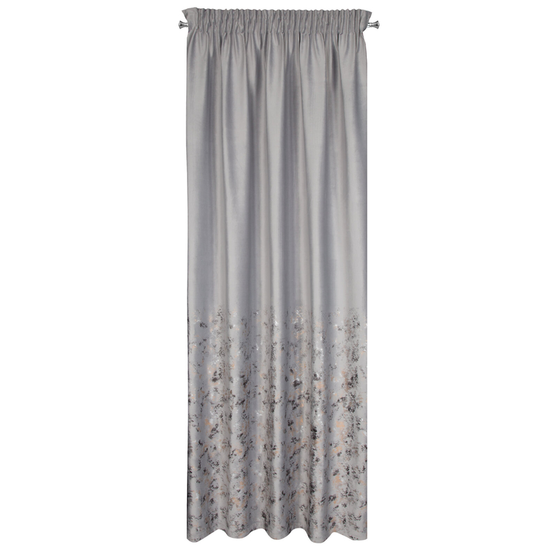 U dołu zasłony zastosowano subtelny, metaliczny nadruk, który pięknie odbija światło i nadaje zasłonie unikalnego charakteru. To ozdobny akcent, który przyciąga spojrzenia, nie dominując przy tym reszty wystroju. Idealna równowaga między klasyką a nowoczesnością.