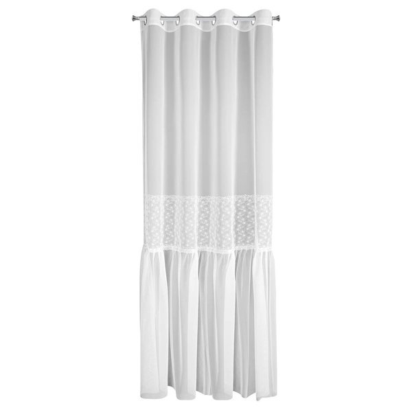Delikatna tkanina o strukturze siateczki uzupełniona haftem i dekoracyjną falbaną tworzy elegancką kompozycję, która podkreśla styl pomieszczenia.