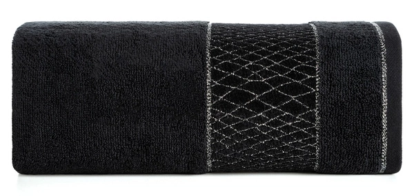 Dekoracyjna bordiura z geometrycznym wzorem utkanym błyszczącą nicią dodaje ręcznikowi luksusowego charakteru. Wzór subtelnie odbija światło, tworząc elegancki akcent pasujący do nowoczesnych i klasycznych aranżacji łazienki.
