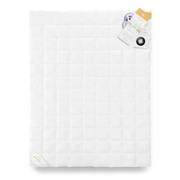 Kołdra o budowie kasetonowej - szyta w technologii ciepłego szwu zapewniającemu lepsze właściwości termoizolacyjne. Kratki są szczelnie zamknięte uniemożliwiając przemieszczaniu się wypełnianiu pomiędzy komorami. Wykończona bizą w srebrnym kolorze.