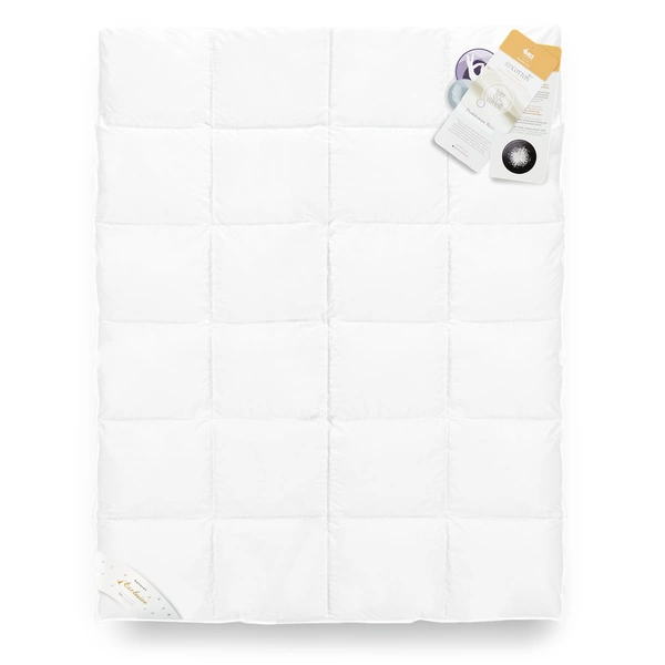 Kołdra o budowie kasetonowej - szyta w technologii ciepłego szwu zapewniającemu lepsze właściwości termoizolacyjne. Kratki są szczelnie zamknięte uniemożliwiając przemieszczaniu się wypełnianiu pomiędzy komorami. Wykończona bizą w srebrnym kolorze.