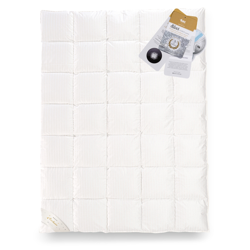 - Kolekcja SILVER to polski puch gęsi 90%, tkaninę pokryciową stanowi super delikatna tkanina - SATYNA - 85% bawełna / 15% lurex SILVER, 128g/m2. Dzięki niemu jest to wyrób antybakteryjny, antyzapachowy oraz ogólnie prozdrowotny z możliwością prania.