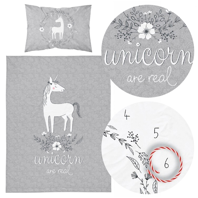 Pościel bambusowa jest wykonana z ekologicznej tkaniny w 50% z bawełny i w 50% włókna bambusowego, co idealnie sprawdzi się do łóżeczka dziecka, ponieważ cały komplet jest bardzo przyjemny w dotyku i nie podrażnia skóry. Dzięki połączeniu bawełny i bambusa pościel posiada termoregulację i antybakteryjne właściwości. Dodatkowym atutem jest wytrzymałość materiału. Komplet zapinany na praktyczny zamek błyskawiczny co ułatwi wymianę pościeli. Cudowne wzory zastosowane na każdej pościli sprawią, że maluch będzie szczęśliwszy a jakość pościeli pozwoli na wspaniały komfort snu. Pościel przedstawia jednorożca na szarym tle z napisem "unicorn are real".