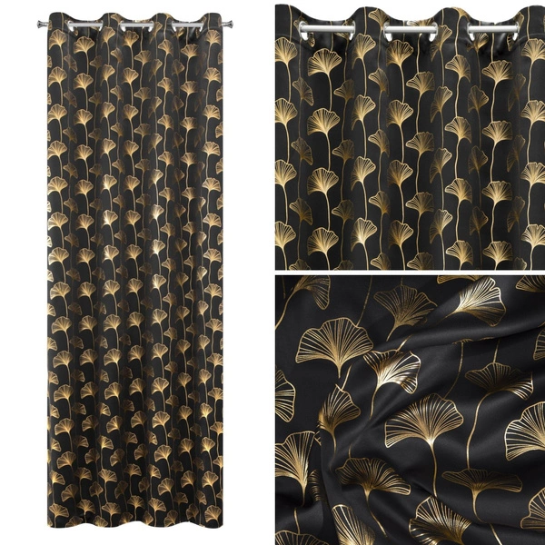 - Zasłona blackout o nowoczesnym stylu z wzorem złotych wachlarzy na tle czarnego koloru. Elegancka dekoracja zawieszana na równomierne przelotki.