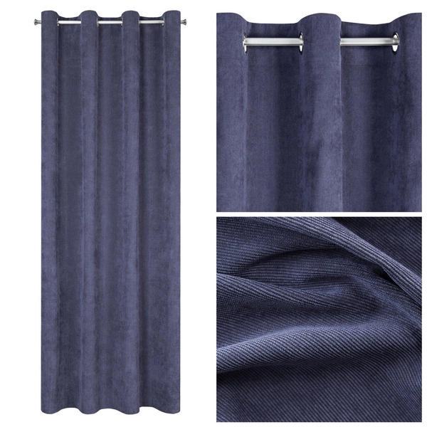 Produkt w granatowym kolorze o strukturze sztruksu. Ładnie dopasowuje się do karnisza. Tkanina jest miła w dotyku oraz ładnie oddaje kolor zasłony. Zawieszana na równomiernie wszyte przelotki, co ułatwia montaż. Bez trudu ułożysz ją w równomierne piękne fale.