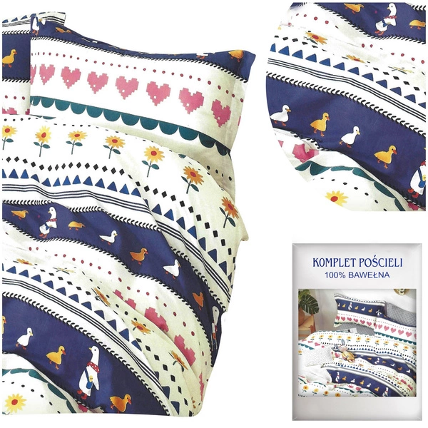 Pościel z satyny bawełnianej to wysokiej jakości materiał o splocie satynowym z włókien bawełnianych, zapewniający wyjątkową miękkość. Ten rodzaj tkaniny wyróżnia się delikatnym połyskiem i jest aksamitny w dotyku. Wysoka struktura włókien pozwala na swobodną cyrkulację powietrza, dzięki czemu, zimą daje nam ciepło a latem chłodzi. Naturalny skład zapewnia, że nasza skóra będzie mogła pod nią swobodnie oddychać. Dodatkowym atutem pościeli jest jej łatwość użytkowania gdyż nie jest śliska, bardzo dobrze przylega do kołdry. Zapinanie na zamek błyskawiczny sprawia, że jest ono szybkie i wygodne podczas wymieniania, mimo iż jest dyskretnie umieszczony. Produkt nie traci kolorów podczas wielokrotnego prania. Należy przed praniem wywrócić pościel z nadrukiem na lewą stronę aby zachować soczyste jej barwy, żywotność i uniknąć otarć od bębna. Pamiętajmy też, zasunąć suwaki w poszwie i powłoczkach aby nie dopuścić do splątania elementów kompletu w trakcie prania, które często powoduje niedokładne wypłukiwanie substancji piorących. Pościel przedstawia wiosenny wzór, na którym są poziome linie ze słonecznikami, kaczki na niebieskim tle lub pixelowymi czerwonymi sercami.