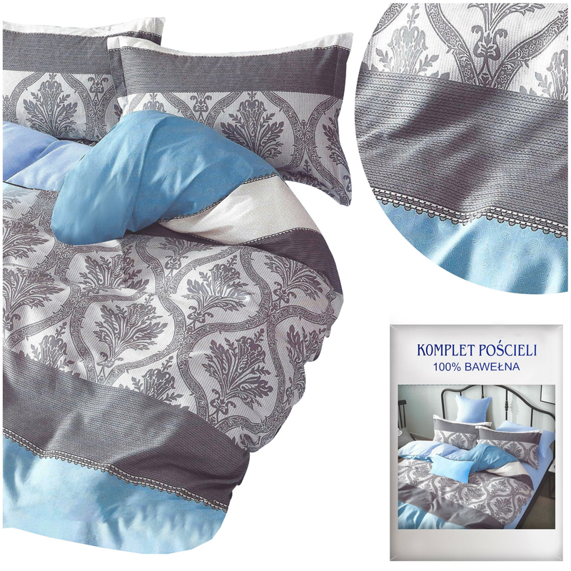 Pościel z satyny bawełnianej to wysokiej jakości materiał o splocie satynowym z włókien bawełnianych, zapewniający wyjątkową miękkość. Ten rodzaj tkaniny wyróżnia się delikatnym połyskiem i jest aksamitny w dotyku. Wysoka struktura włókien pozwala na swobodną cyrkulację powietrza, dzięki czemu, zimą daje nam ciepło a latem chłodzi. Naturalny skład zapewnia, że nasza skóra będzie mogła pod nią swobodnie oddychać. Dodatkowym atutem pościeli jest jej łatwość użytkowania gdyż nie jest śliska, bardzo dobrze przylega do kołdry. Zapinanie na zamek błyskawiczny sprawia, że jest ono szybkie i wygodne podczas wymieniania, mimo iż jest dyskretnie umieszczony. Produkt nie traci kolorów podczas wielokrotnego prania. Należy przed praniem wywrócić pościel z nadrukiem na lewą stronę aby zachować soczyste jej barwy, żywotność i uniknąć otarć od bębna. Pamiętajmy też, zasunąć suwaki w poszwie i powłoczkach aby nie dopuścić do splątania elementów kompletu w trakcie prania, które często powoduje niedokładne wypłukiwanie substancji piorących. Komplet przedstawia szary wzór z ornamentów i poziomych pasów na kołdrze i poszewkach. Dodatkowo na kołdrze pomiędzy wzorem jest jednolity niebieski kolor.