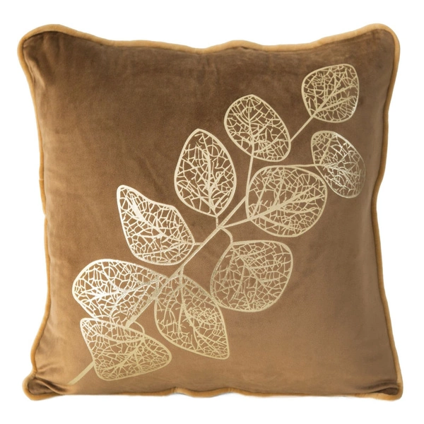 Wykonany z dobrej jakości, miłej w dotyku tkaniny produkt prezentuje się jeszcze bardziej szykownie dzięki welwetowemu, delikatnie połyskującemu wykończeniu. Nadruk złotych liści oprawiony w miodowym tle dodatkowo upiększa ozdobę, która bez trudu wkomponuje się do każdego stylowo urządzonego wnętrza.